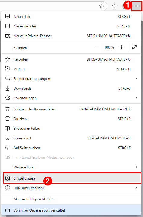 - Um im Browser Microsoft Edge gespeicherte Passwörter zu exportieren, zunächst über das Dreipunkt-Symbol (1) die Einstellungen (2) öffnen: