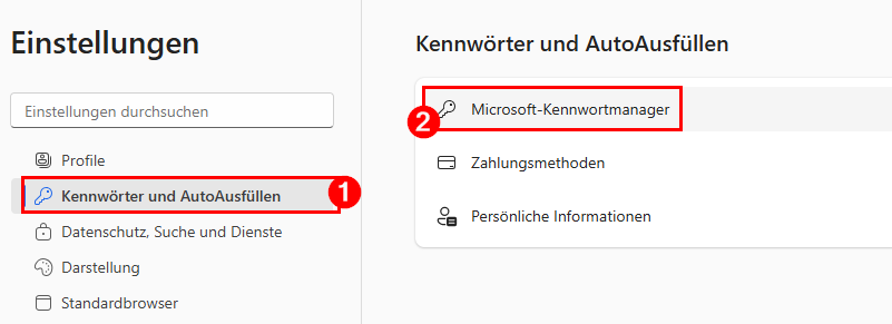 - Dort die Menüpunkte „Kennwörter und AutoAusfüllen“ (1) und „Microsoft-Kennwortmanager“ (2) auswählen: