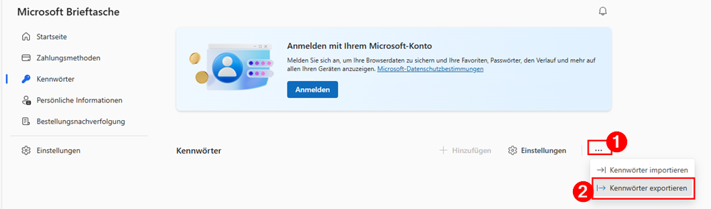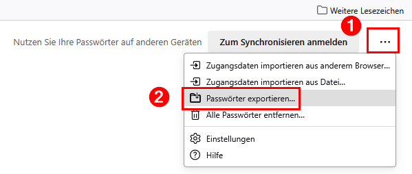 - Über das Dreipunkt-Menü (1) oben rechts „Passwörter exportieren“ (2) auswählen: