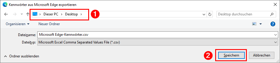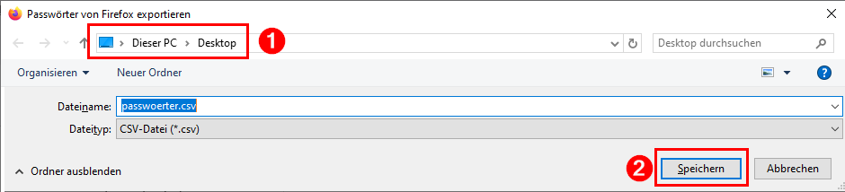 - Einen passenden Datei-Speicherort auswählen (1) und den Export mit „Speichern“ (2) abschließen: