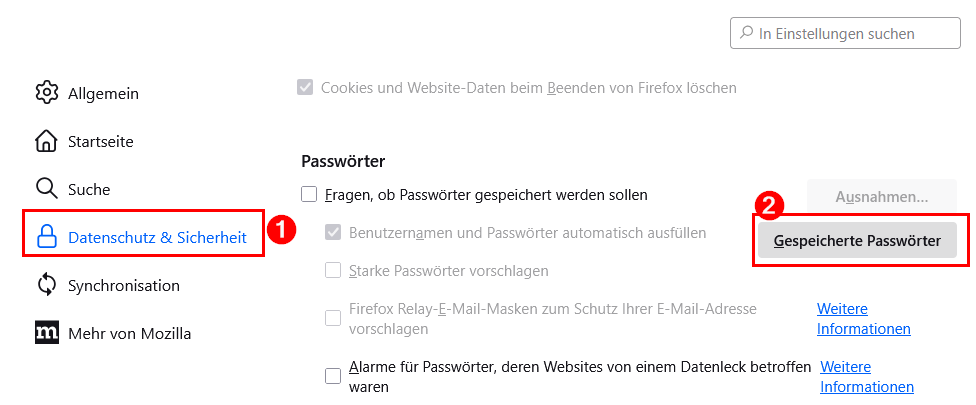 - Dort den Menüpunkt „Datenschutz & Sicherheit“ (1) und die Option „Gespeicherte Passwörter“ (2) auswählen: