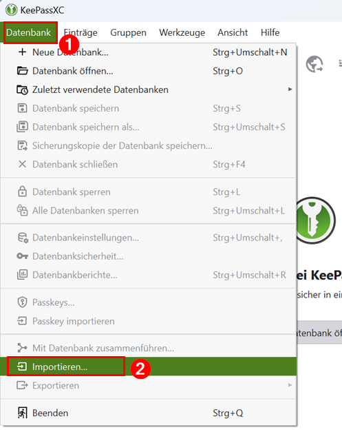 - In KeePass XC zum Import der CSV-Datei nun unter „Datenbank“ (1) den Menüpunkt „Importieren“ (2) auswählen:
