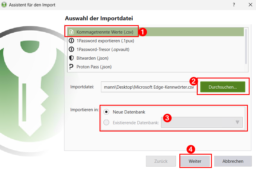 - Als Format „Kommagetrennte Werte (.csv)“ (1) einstellen sowie die oben erstellte Datei über „Durchsuchen“ (2) auswählen. Festlegen, ob die Passwörter in eine neue oder in eine bestehende Datenbank eingefügt werden sollen (3). Mit „Weiter“ (4) bestätigen: