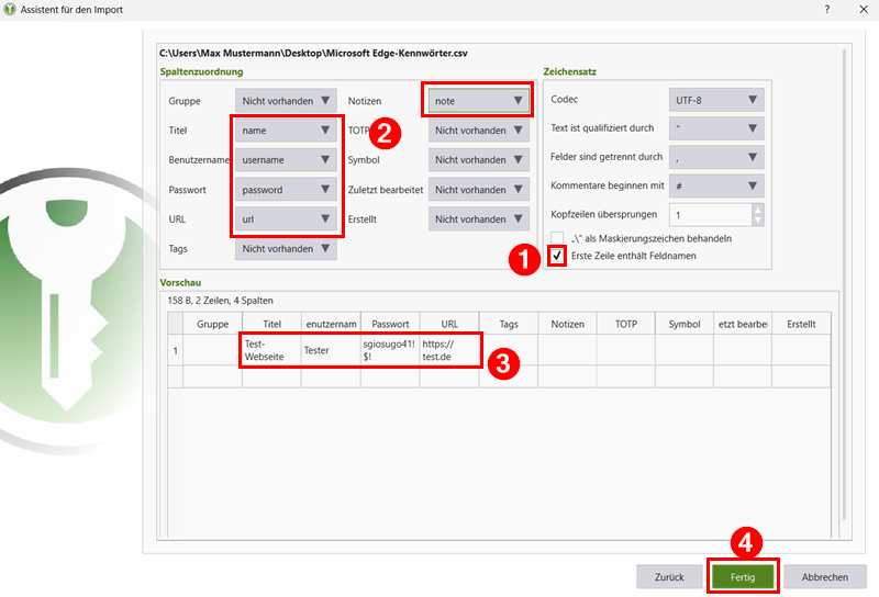 - Das Häkchen für „Erste Zeile enthält Feldnamen“ (1) setzen, die Spaltenzuordnungen von KeePass XC den Feldnamen der CSV-Datei passend zuordnen (2). Bei korrekter Zuordnung werden die Inhalte in der Vorschau angezeigt (3). Wenn alles stimmig ist, mit „Fertig“ (4) bestätigen: