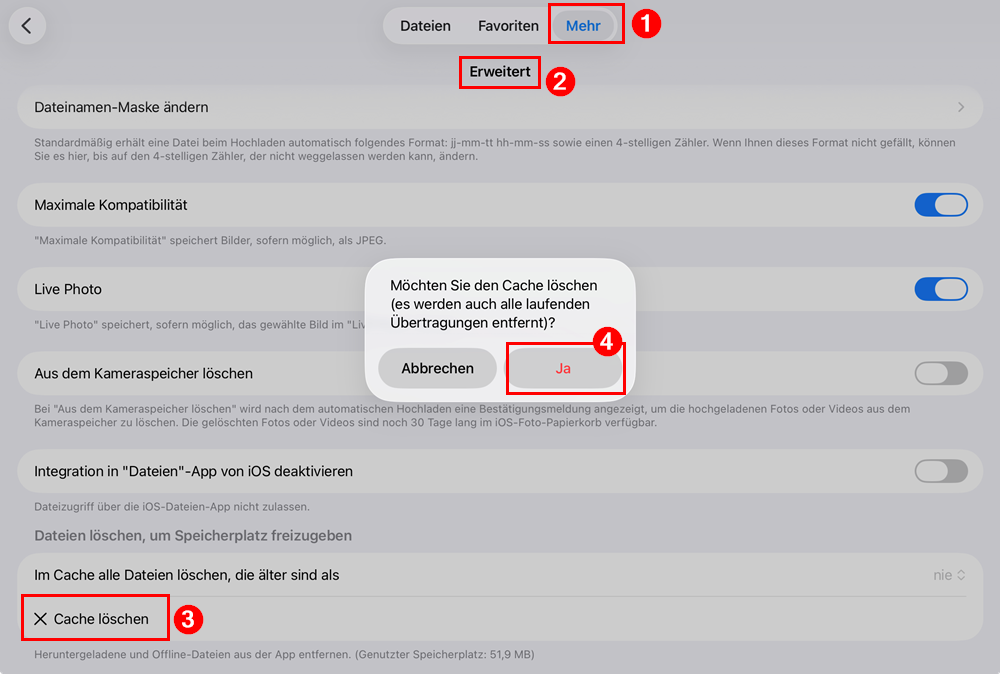 Lösung: Zur Freigabe des Speicherplatzes öffnen Sie innerhalb der App “Online-Dateiablage” den Menüpunkt “Mehr” (1), dort die „Einstellungen“ und den Menüpunkt “Erweitert” (2). Wählen Sie hier die Option “Cache löschen” (3) und bestätigen Sie die anschließende Abfrage mit “Ja” (4):