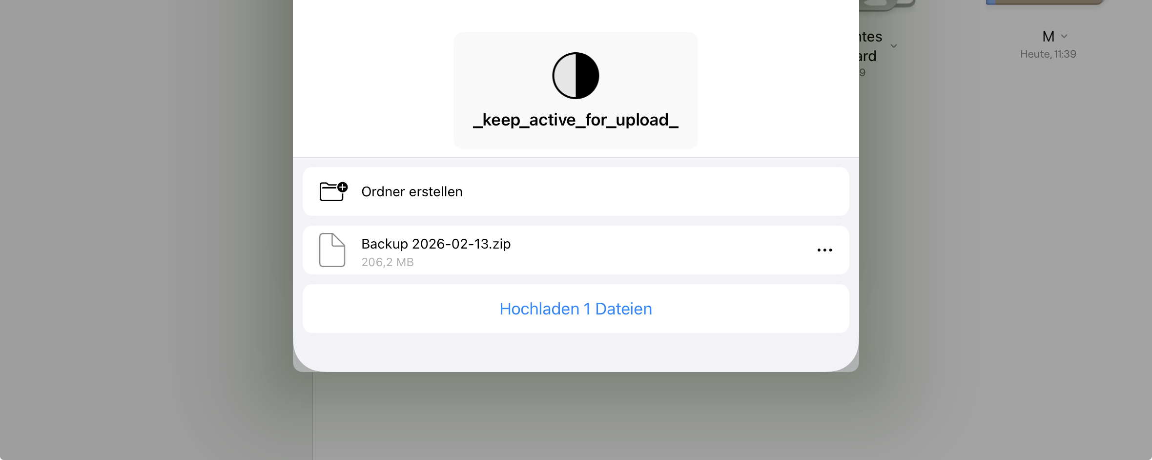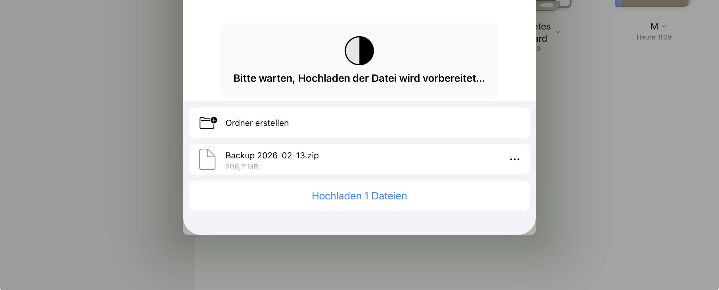 Hinweis: Bei großen Backup-Dateien erscheinen im Anschluss zwei Statusmeldungen zum Vorbereiten und Durchführen des Uploads. Die Statusanzeige verändert sich hier jeweils erst, sobald die Hälfte des jeweiligen Vorgangs abgeschlossen wurde. Die Goodnotes-App darf während des gesamten Prozesses nicht geschlossen werden.